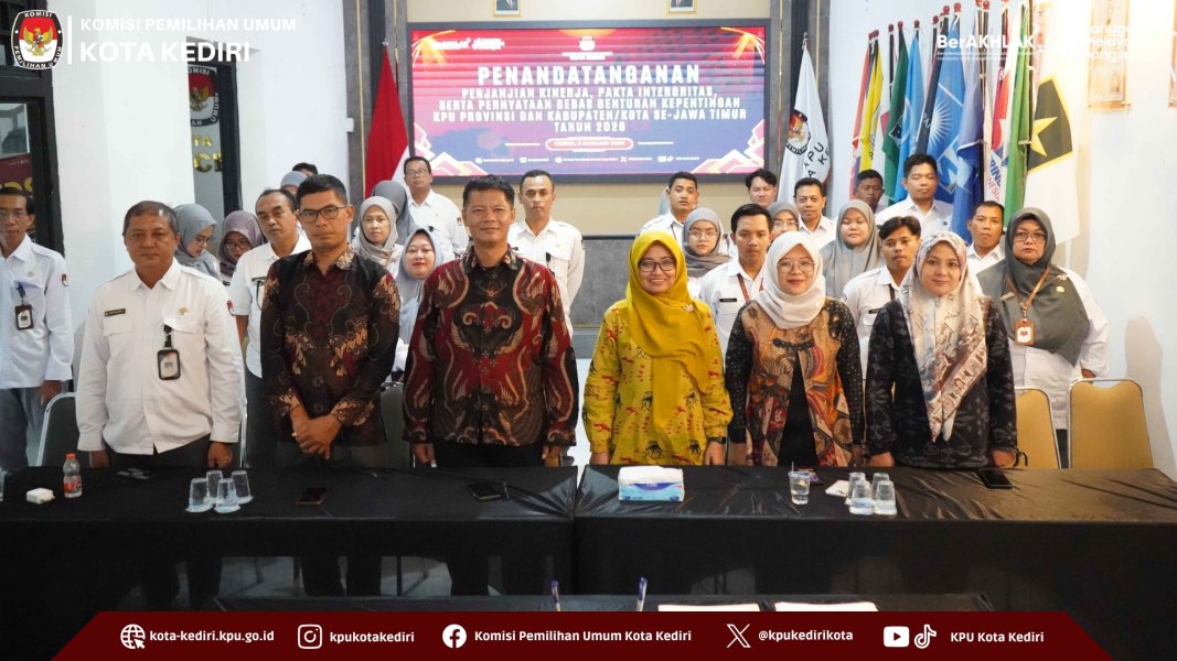Kediri (kota-kediri.kpu.go.id) — KPU Provinsi Jawa Timur menyelenggarakan Penandatanganan Perjanjian Kinerja Tahun 2026, Pakta Integritas, serta Pernyataan Bebas Benturan Kepentingan di lingkungan KPU Provinsi Jawa Timur pada Kamis (8/1). Kegiatan ini dilaksanakan secara daring melalui Zoom Meeting dan diikuti oleh seluruh jajaran KPU Kabupaten/Kota se-Jawa Timur. Penandatanganan tersebut menjadi wujud komitmen bersama dalam mewujudkan tata kelola kelembagaan yang profesional, berintegritas, dan akuntabel. KPU Kota Kediri turut mengikuti kegiatan tersebut secara daring melalui Zoom Meeting. Seluruh jajaran KPU Kota Kediri yang terdiri atas Ketua, Anggota, Sekretaris, Kepala Subbagian, serta staf mengikuti rangkaian kegiatan dan menandatangani dokumen Perjanjian Kinerja, Pakta Integritas, serta Pernyataan Bebas Benturan Kepentingan secara serentak. Kegiatan kemudian dilanjutkan dengan pengarahan pimpinan KPU Provinsi Jawa Timur. Ketua KPU Provinsi Jawa Timur, Aang Kunaifi, menegaskan bahwa penandatanganan dokumen tersebut tidak hanya bersifat seremonial atau sekadar pemenuhan administrasi, namun harus dipahami dan dilaksanakan substansinya oleh seluruh jajaran. “Kita patut berbangga karena Jawa Timur menjadi provinsi pertama di Indonesia yang melaksanakan penandatanganan ini,” ujar Aang Kunaifi. Lebih lanjut, Aang Kunaifi mengingatkan seluruh jajaran KPU di Jawa Timur agar berkomitmen melaksanakan program dan kegiatan sesuai dengan Rencana Strategis (Renstra) serta visi dan misi KPU pada tahun berjalan, guna mendukung terciptanya penyelenggaraan pemilu yang berkualitas dan berintegritas. wsw