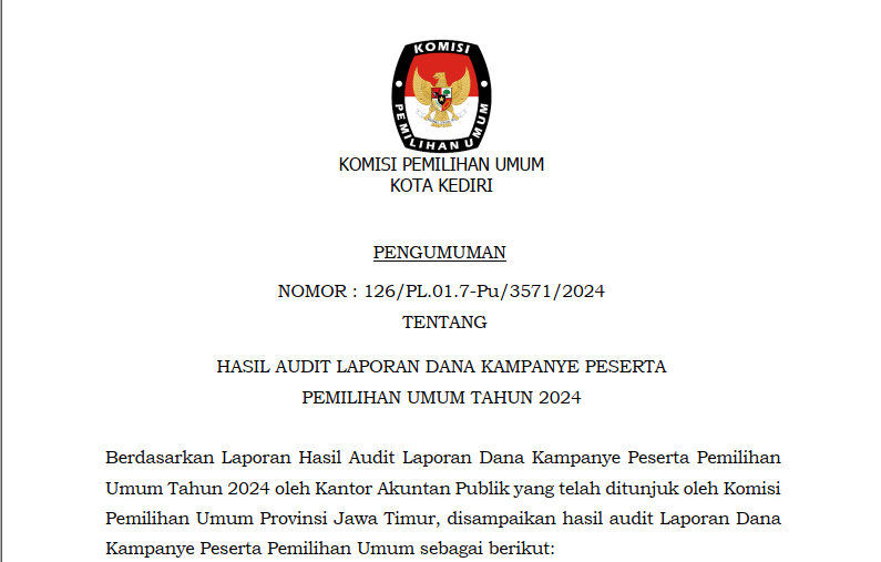 PENGUMUMAN HASIL AUDIT DANA KAMPANYE PARTAI POLITIK PEMILU 2024 Kamis, 04 April 2024 10:00 711 PENGUMUMAN HASIL AUDIT DANA KAMPANYE PARTAI POLITIK PEMILU 2024 DAPAT DIDOWNLOAD DISINI Baca Selengkapnya