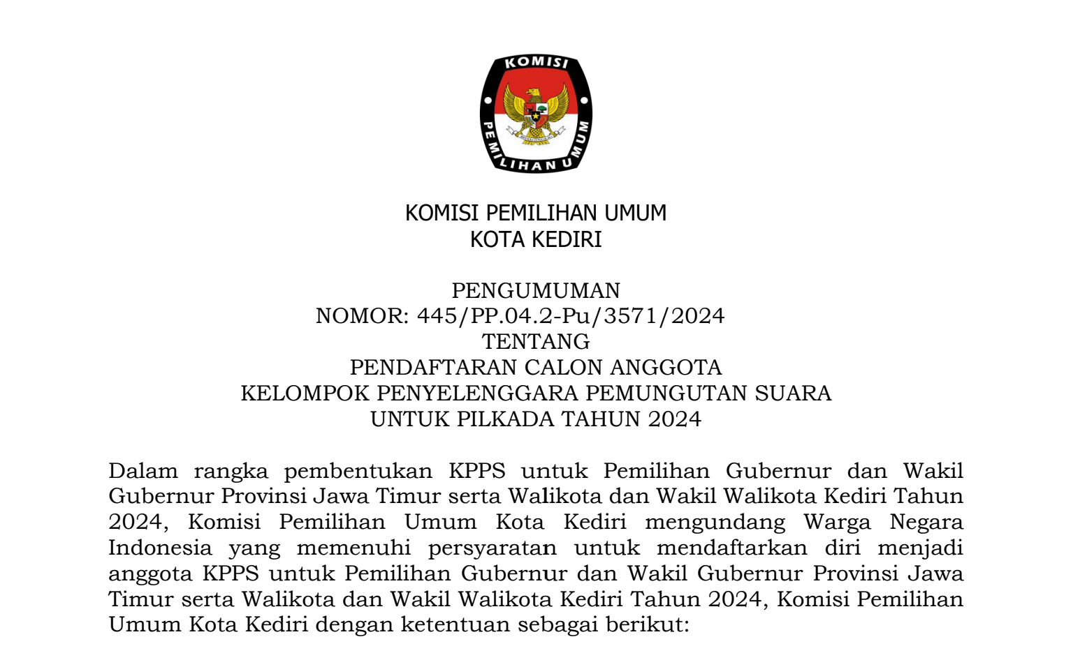PENGUMUMAN PENDAFTARAN CALON ANGGOTA KELOMPOK PENYELENGGARA PEMUNGUTAN SUARA UNTUK PILKADA TAHUN 2024 Selasa, 17 September 2024 01:00 928 PENGUMUMAN PENDAFTARAN CALON ANGGOTA KELOMPOK PENYELENGGARA PEMUNGUTAN SUARA UNTUK PILKADA TAHUN 2024 DAPAT DIUNDUH DI SINI Baca Selengkapnya
