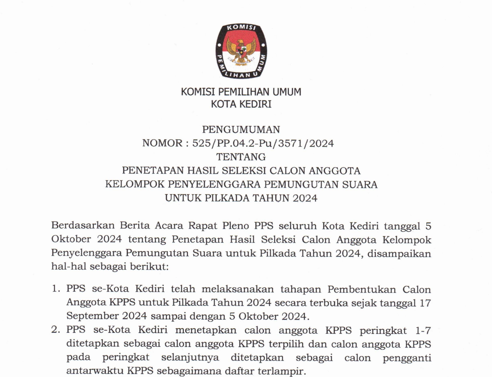 PENGUMUMAN PENETAPAN HASIL SELEKSI CALON ANGGOTA KELOMPOK PENYELENGGARA PEMUNGUTAN SUARA UNTUK PILKADA TAHUN 2024 Senin, 07 Oktober 2024 23:00 818 PENGUMUMAN PENETAPAN HASIL SELEKSI CALON ANGGOTA KELOMPOK PENYELENGGARA PEMUNGUTAN SUARA UNTUK PILKADA TAHUN 2024 DAPAT DIUNDUH DI SINI Baca Selengkapnya