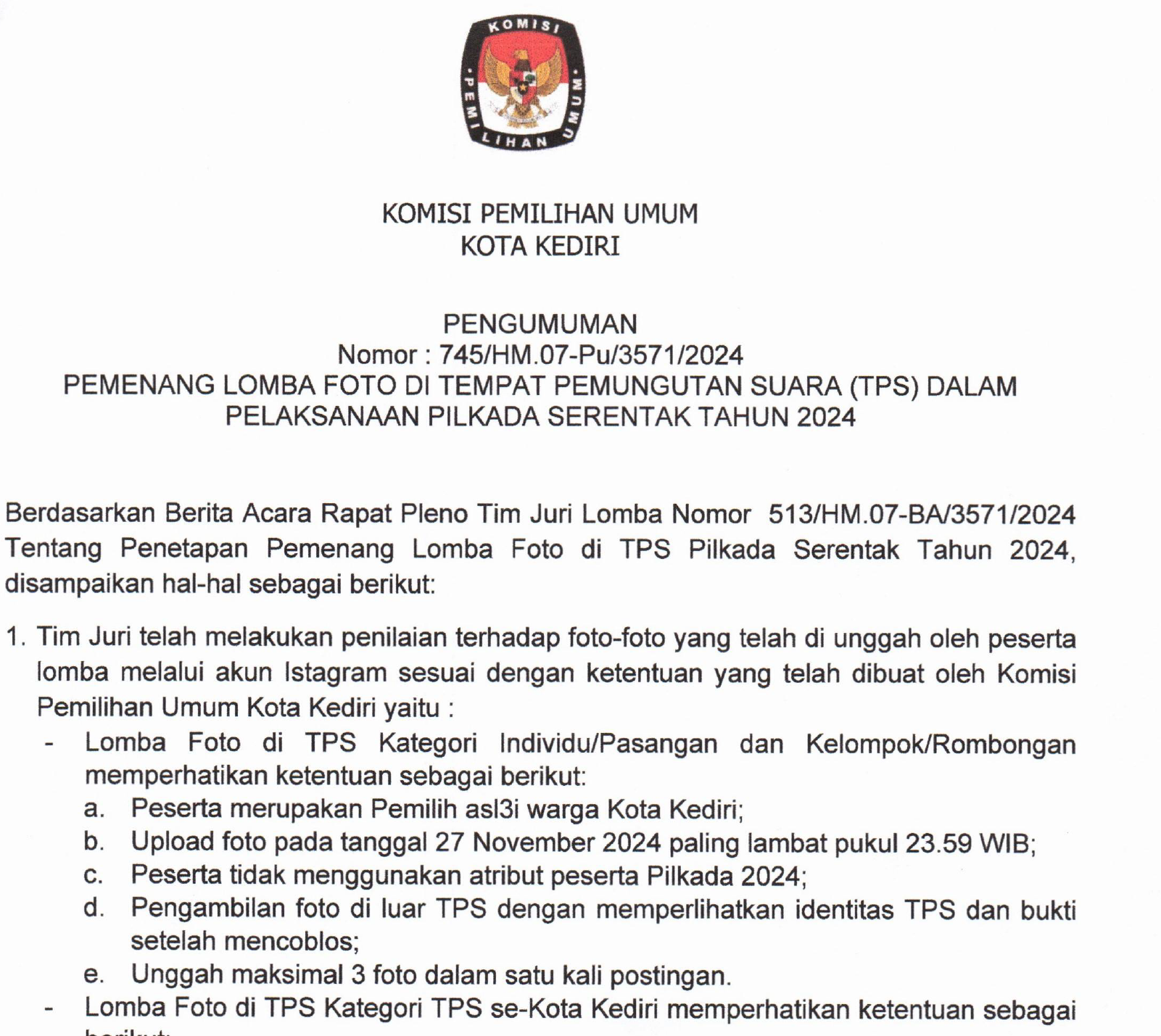 PENGUMUMAN PEMENANG LOMBA FOTO DI TEMPAT PEMUNGUTAN SUARA (TPS) DALAM PELAKSANAAN PILKADA SERENTAK TAHUN 2024 Selasa, 10 Desember 2024 15:00 885 PENGUMUMAN PEMENANG LOMBA FOTO DI TEMPAT PEMUNGUTAN SUARA (TPS) DAPAT DIUNDUH DI SINI Baca Selengkapnya
