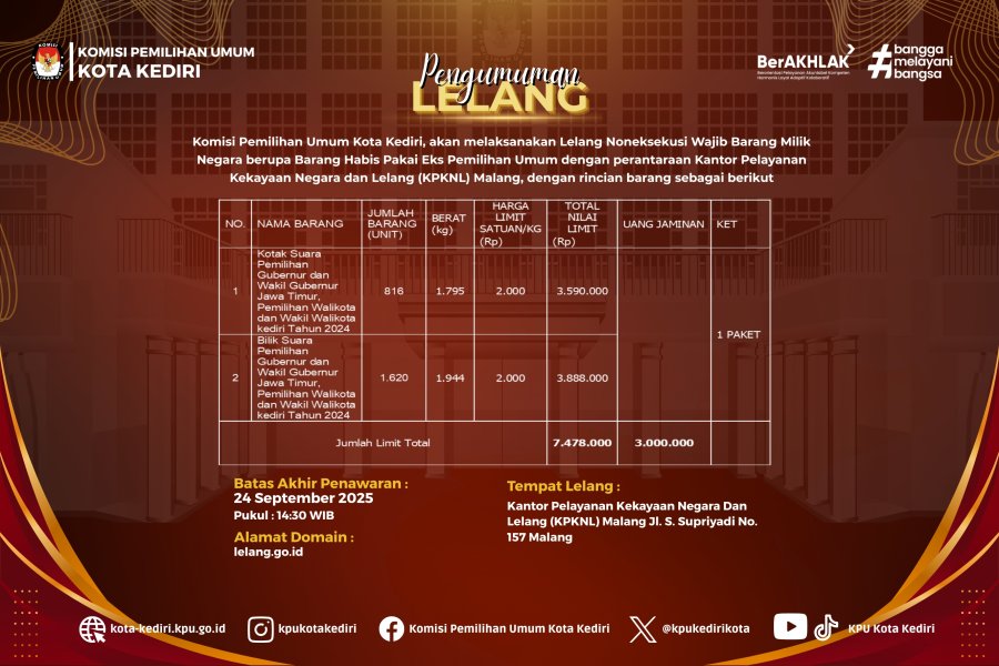 PENGUMUMAN LELANG KOTAK BILIK PEMILU 2024 KPU KOTA KEDIRI Jumat, 19 September 2025 14:00 36 INFORMASI PENGUMUMAN LELANG KOTAK BILIK KPU KOTA KEDIRI DAPAT DILIHAT/DIUNDUH PADA LINK DI BAWAH INI Download (PDF) Baca Selengkapnya