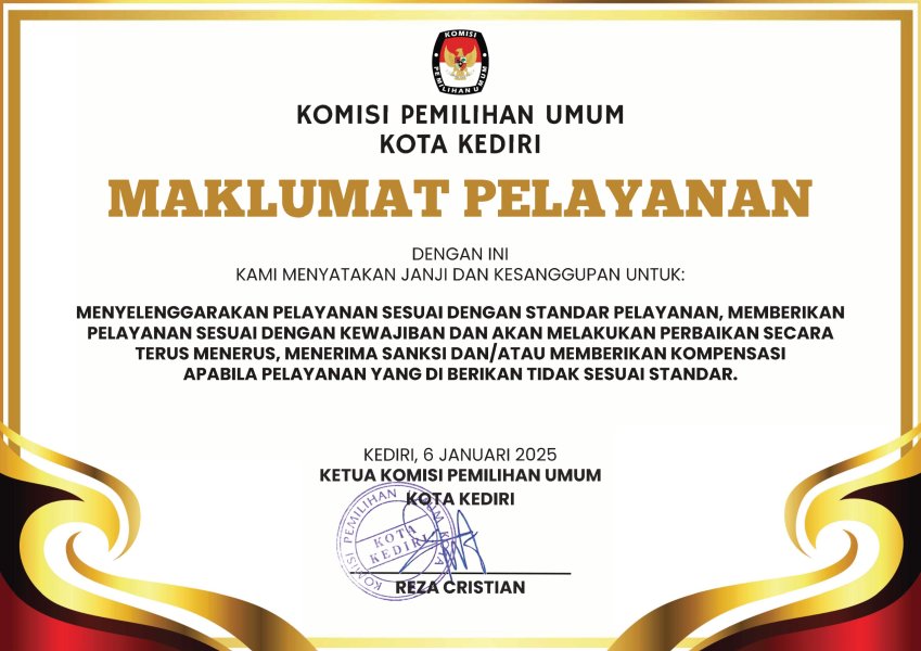 MAKLUMAT PELAYANAN TAHUN 2025 Senin, 22 September 2025 09:55 19 Maklumat Pelayanan KPU Kota Kediri Tahun 2025 dapat diunduh di sini Bagikan: Telah dilihat 19 kali