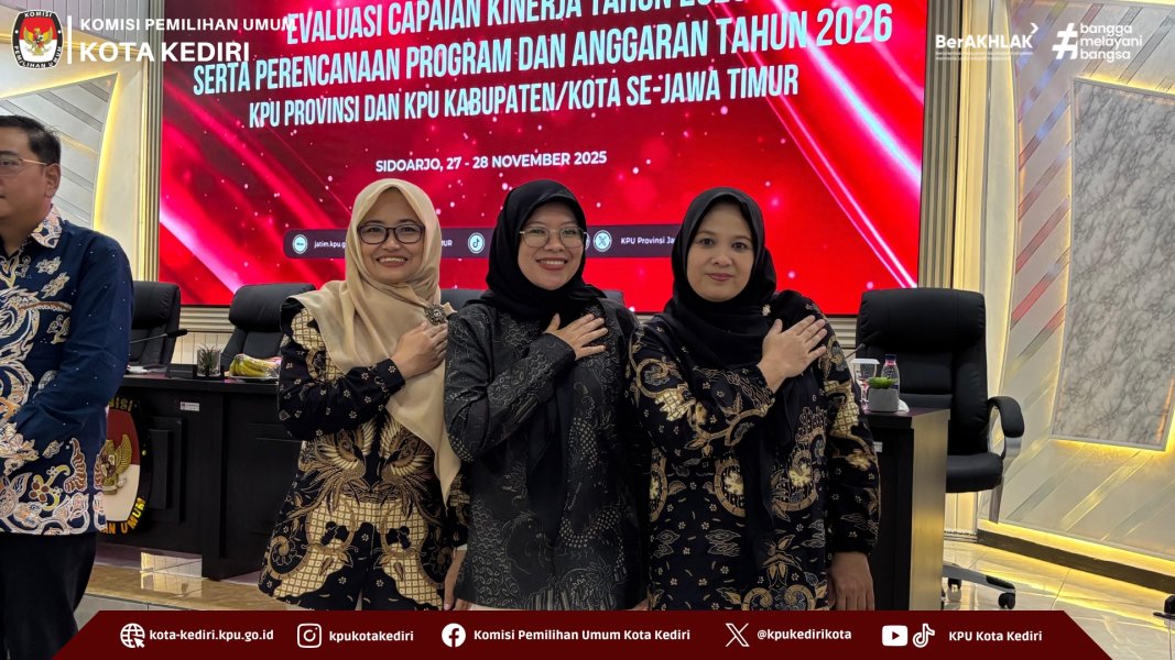 Sidoarjo (kota-kediri.kpu.go.id) – KPU Kota Kediri menghadiri Rapat Pimpinan Evaluasi Capaian Kinerja Tahun 2025 serta Penyusunan Program dan Anggaran Tahun 2026 bersama KPU Provinsi dan KPU Kabupaten/Kota se-Jawa Timur. Kegiatan ini diselenggarakan oleh KPU Provinsi Jawa Timur pada Kamis–Jumat, 27–28 November 2025, bertempat di Kantor KPU Kabupaten Sidoarjo.