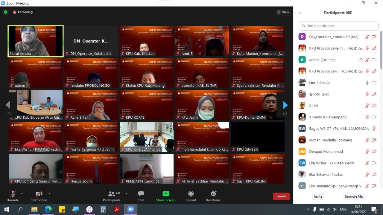 Sebagaimana diketahui, Rapat Koordinasi Pemutakhiran Daftar Pemilih Berkelanjutan Semester II Tahun 2021 dan Sosialisasi Peraturan KPU Nomor 6 Tahun 2021, selain mengundang ketua dan anggota divisi perencanan, data dan informasi KPU Kota/Kabupaten Se-Jawa Timur, juga dihadiri oleh stakeholder lain seperti Dispenduk, TNI/POLRI, Kemenag, Dispendik dan lain sebagainya. Semenara itu dari KPU Kota Kediri hadir ketua KPU, Pusporini Endah Palupi dan Nasrudin selaku anggota divisi perencanan, data dan informasi. nasr
