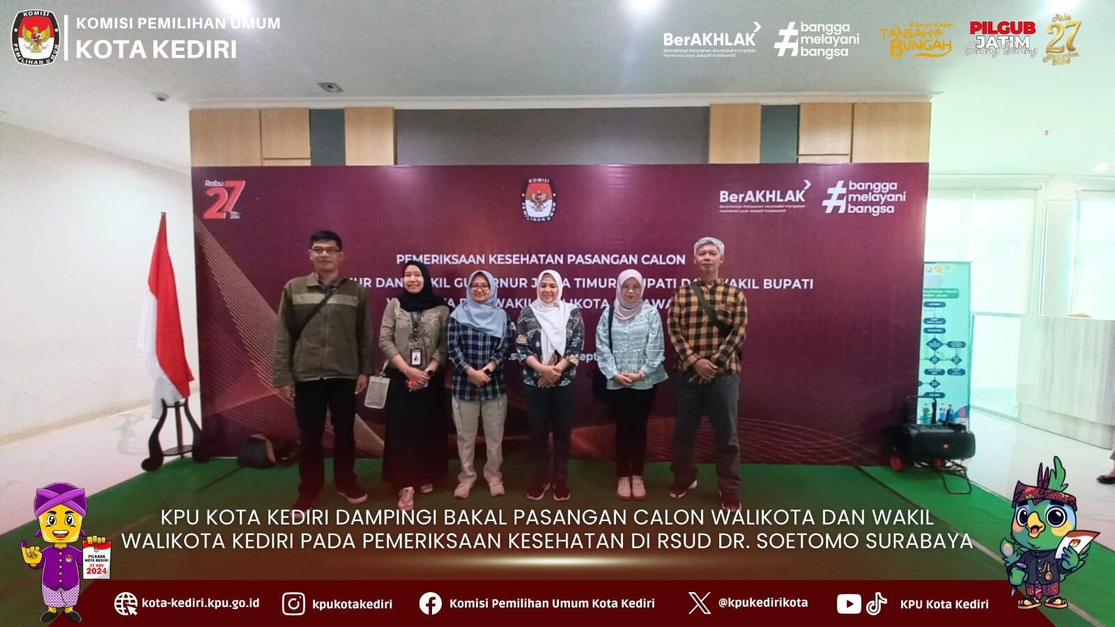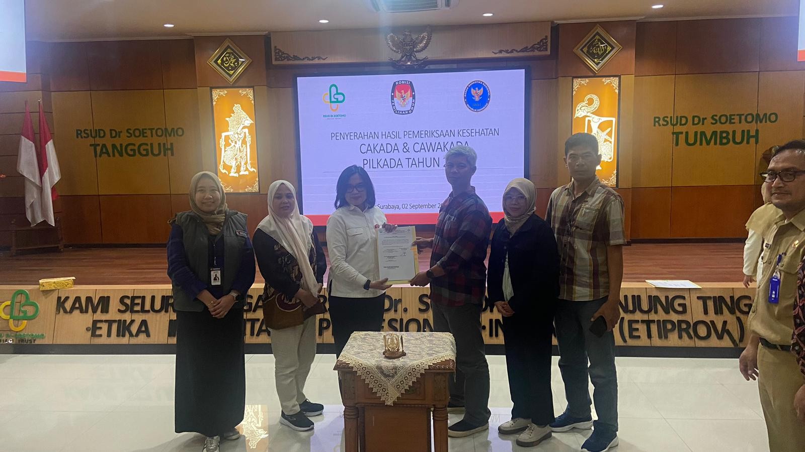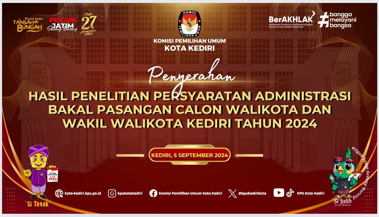 kota-kediri.kpu.go.id - Komisi Pemilihan Umum (KPU) Kota Kediri menghadiri undangan penyerahan penandatanganan berita acara hasil pemeriksaan kesehatan bakal pasangan calon (Bapaslon) Walikota dan Wakil Walikota Kediri di ruang Loka Widya RSUD Dr. Soetomo, Surabaya, pada Senin, 2 September 2024. Acara tersebut diawali dengan sambutan Ketua KPU Provinsi Jawa Timur Aang Kunaifi dan Direktur RSUD Dr. Soetomo Surabaya Cita Rosita Sigit Prakoeswa. Dalam sambutannya, Ketua KPU Provinsi Jawa Timur Aang Kunaifi mengucapkan rasa terima kasih atas kerjasama RSUD Dr. Soetomo Surabaya dalam memberikan pelayanan pemeriksaan kesehatan terhadap bakal calon kepala daerah (bacakada) dan bakal calon wakil kepala daerah (bacawakada) tahun 2024. Di tempat yang sama, Direktur RSUD Dr. Soetomo Surabaya Cita Rosita Sigit Prakoeswa menyampaikan, bahwa pihaknya memberikan pelayanan terbaik dengan menurunkan tim pemeriksa dan tenaga medis secara maksimal. "Hal ini bertujuan untuk menjamin kelancaran pemeriksaan kesehatan cakada dan cawakada 2024. Sehingga bisa memenuhi target pada tanggal 2 September 2024 hasil kesimpulan dari pemeriksaan tersebut dikeluarkan," terang Cita Rosita Cita Rosita juga menyampaikan bahwa tim pemeriksa dan tenaga medis mempunyai integritas yang tinggi dan tidak ada tekanan dari pihak manapun serta tidak ada kepentingan politik apapun dalam kegiatan tersebut. Selanjutnya, KPU Kota Kediri menerima berita acara hasil pemeriksaan kesehatan bapaslon yang ditandatangani oleh Ketua KPU Kota Kediri Reza Cristian dan Direktur RSUD Dr. Soetomo Cita Rosita yang didampingi oleh anggota KPU Kota Kediri dan anggota Bawaslu Kota Kediri. Sebagai tambahan informasi bahwa sesuai tahapan KPU Kota Kediri kemudian melaksanakan verifikasi administrasi terhadap dokumen persyaratan calon sampai tgl 4 September 2024. Kemudian hasil verifikasi administrasi tersebut akan disampaikan kepada Tim Bapaslon Walikota dan Wakil Walikota Kediri pafa 5- 6 September 2024 dalam bentuk Berita Acara Verifikasi Administrasi. (Cha)
