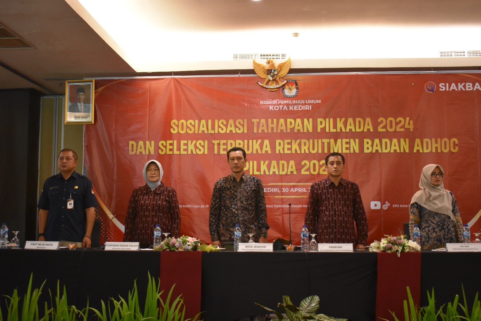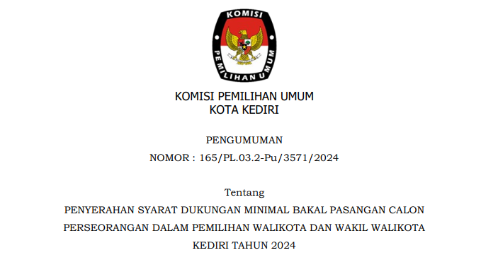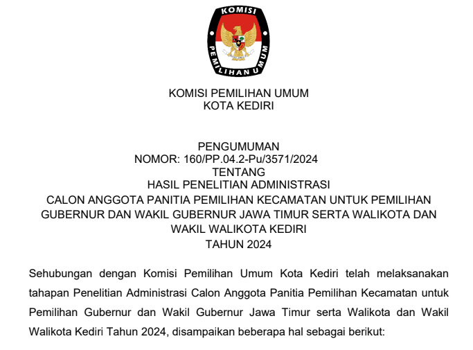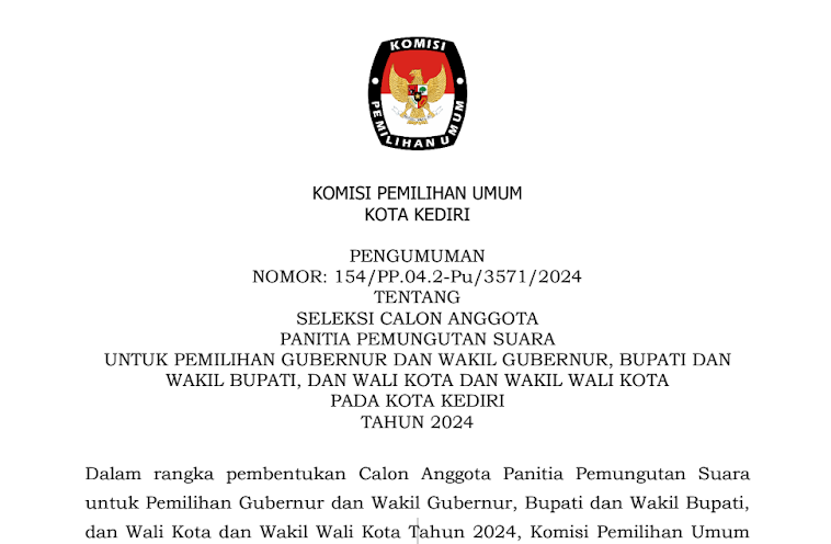 kotakediri.kpu.go.id - KPU Kota Kediri melaksanakan Sosialisasi Tahapan Pilkada 2024 dan Rekrutmen Badan Adhoc Pilkada 2024 di Hotel Grand Surya, Selasa (30/4/2024) dengan mengundang Bagian Pemerintahan, Diskominfo, Dinsos, Dinkes, Bakesbangpol, Bawaslu, Camat, Lurah, FKUB, dan Ormas se-Kota Kediri.