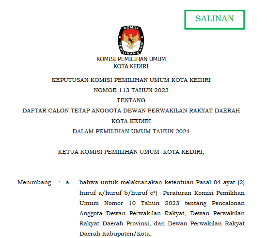 Sesuai PKPU 14 Tahun 2023 tentang Perlengkapan pemungutan suara, Dukungan Perlengkapan lainnya dan Perlengkapan pemungutan suara lainnya disebutkan bahwa Bilik pemungutan suara digunakan untuk menjamin kerahasiaan Pemilih dalam melakukan pemungutan suara, adapun Jumlah bilik pemungutan suara disediakan sebanyak 4 (empat) buah pada setiap TPS. Mengacu pada PKPU tersebut maka kebutuhan Bilik suara untuk KPU Kota Kediri sejumlah 3.424 buah untuk 856 TPS. Berdasarkan kebutuhan, bilik pemungutan suara KPU Kota kediri kurang 1.434 buah dan tinggal menunggu kedatangan bersama logistik yang lain. Terkait dengan proses pengadaan Logistik Pemilu 2024, prosesnya ada yang dilaksanakan oleh KPU RI, ada yang oleh KPU Provinsi dan ada yang dilaksanakan oleh KPU Kabupaten/Kota. Adapun untuk Bilik suara, proses pengadaannya oleh KPU RI.