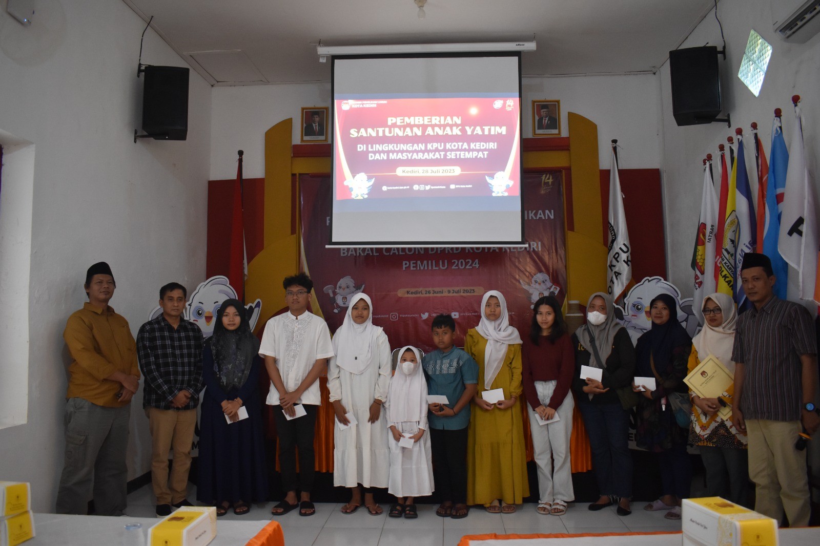 kota-kediri.kpu.go.id - Jum'at 28 Juli 2023, KPU Kota Kediri mengundang yatim piatu yang ada di sekitaran kantor untuk hadir dalam kegiatan Santunan Yatim Piatu. Kegiatan ini dilaksanakan berdasarkan arahan dari KPU RI melalui Surat Edaran Komisi Pemilihan Umum Republik Indonesia Nomor 2723/TU.01.1-SD/03/2023 tanggal 26 Juli 2023 tentang Pemberian Santunan Anak Yatim di Lingkungan KPU dan Masyarakat Setempat. Kegiatan Pemberian Santunan Anak Yatim di Lingkungan KPU Kota Kediri merupakan salah satu bentuk kepedulian KPU Kota Kediri terhadap masyarakat sekitar. Diharapkan kegiatan dengan masyarakat sekitar seperti ini dapat terus dilakukan, sehingga nantinya semua dapat saling berkumpul dan berbagi. KPU Kota Kediri juga berharap masyarakat dapat bersama-sama ikut mendoakan kelancaran dan kesuksesan Pemilu di tanggal 14 Februari 2024. Ucapan terima kasih dan memohon dukungan agar Pemilu 2024 dapat terlaksana dengan baik dan lancar disampaikan oleh Moch. Wahyudi divisi SDM, Sosdiklih dan Parmas dalam sambutannya. Santunan dihadiri oleh 10 orang Yatim Piatu bersama pendamping, Komisioner KPU Kota Kediri dan Sekretariat KPU Kota Kediri. fa