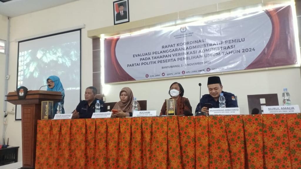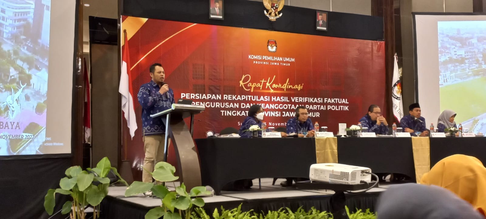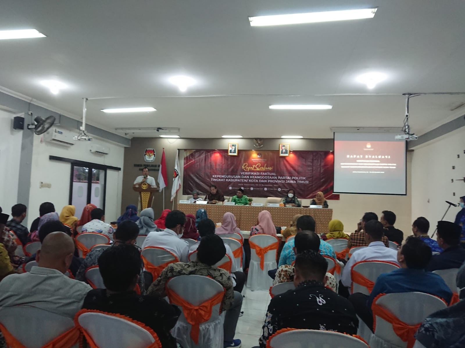 kota-kediri.kpu.go.id - Komisi Pemilihan Umum Kota Kediri menghadiri Rapat Evaluasi Tahapan Verifikasi Kepengurusan dan Keanggotaan Partai Politik Calon Peserta Pemilu 2024 pada Kamis, 10-12 November 2022 di KPU Kota Pasuruan. Rapat Evaluasi digelar setelah KPU Kabupaten/Kota menuntaskan kegiatan verifikasi faktual partai politik di masing-masing wilayahnya. Hadir dari KPU Kota Kediri sebagai peserta yakni Nia Sari, Divisi Teknis Penyelenggaraan, Ar Suryawan S (Kasubbag Tekmas) serta Operator Naelli Himmah (Admin SIPOL). Sesuai dengan ketentuan tahapan, program, dan jadwal, verifikasi faktual kepengurusan dan Keanggotaan partai politik dilaksanakan selama dua puluh hari, berakhir pada 4 November 2022. Ketua KPU Jatim, Choirul Anam dalam kesempatan membuka acara mengatakan jika kerja-kerja verifikasi faktual dengan berbagai dinamikanya harus menjadi pembelajaran sebelum kita melangkah menuju Tahapan verifikasi faktual perbaikan pada 24 Nov – 7 Des 2022 di tingkat KPU Kab/Kota. Hal ini menjadi sangat penting. Sebab dalam prosesnya, Tahapan verifikasi faktual perbaikan yang sangat pendek tersebut agar dapat disiasati dimanajemeni dengan baik oleh KPU Kab/Kota. Divisi Teknis KPU Kota Kediri mengungkapkan bahwa rapat evaluasi tersebut untuk perbaikan dan persiapan verifikasi kepengurusan serta keanggotaan partai politik perbaikan tingkat KPU Kab/Kota. Serta, guna membaca ulang catatan pelaksanaan kegiatan tahapan verifikasi kepengurusan dan keanggotaan Parpol termasuk melakukan pencermatan, atas kelebihan dan kekurangan proses pelaksanaan verifikasi tersebut. Kegiatan rapat evaluasi tersebut dihadiri sebanyak 114 peserta yang terdiri dari Divisi Teknis Penyelenggaraan, Kepala Sub Bagian (Kasubbag) Teknis Penyelenggaraan Pemilu, Partisipasi, dan Hubungan Masyarakat, serta Admin/Verifikator Sistem Informasi Partai Politik 38 KPU Kabupaten/Kota se Jawa Timur. Turut hadir dari KPU Jatim, Kepala Bagian Teknis Penyelenggaraan Pemilu, Partisipasi, dan Hubungan Masyarakat Popong Anjarseno, Kasubbag Teknis Penyelenggaraan Pemilu Eddy Prayitno, Ars