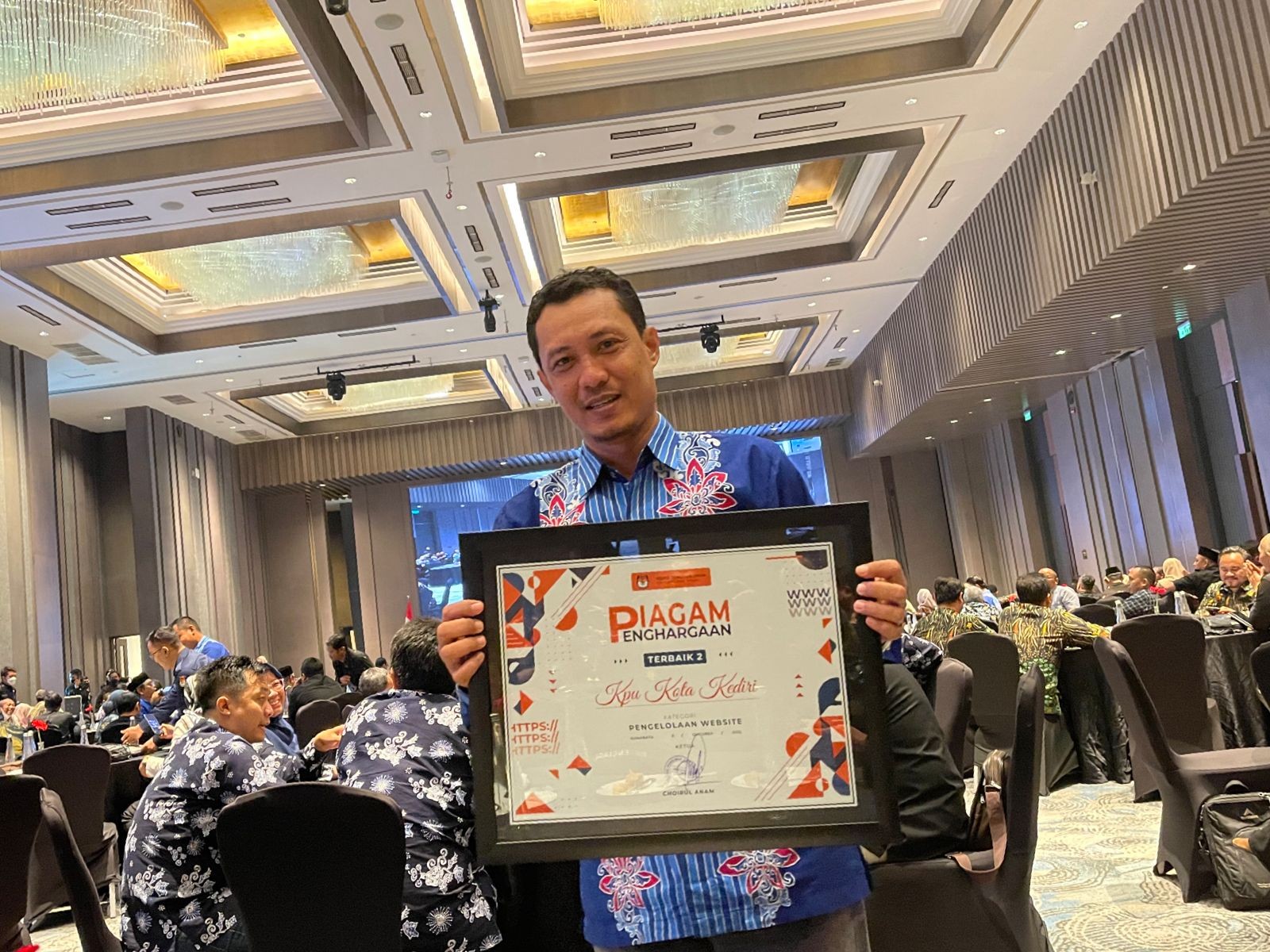kota-kediri.kpu.go.id - KPU Kota Kediri menerima dua penghargaan dari KPU Provinsi Jawa Timur yaitu Penghargaan terbaik Ke-2 dalam pengelolaan data padan Pemutakhiran data pemilih berkelanjutan dan Terbaik ke-2 dalam pengelolaan website. Penghargaan tersebut diterimakan pada forum Rapat Pimpinan KPU provinsi Jatim dan KPU Kabupaten Kota se-Jawa Timur yang digelar di Surabaya 3-5 Oktober 2022. Nasrudin Komisioner KPU Kota Kediri Divisi Perencanaan Data dan Informasi mewakili KPU Kota Kediri menerima penghargaan Terbaik ke-2 Pengelolaan data padan mengucapkan terimakasih kepada komisioner dan staff yang telah membantu dalam proses pengelolaan data padan, terutama kepada Kasubag Program data dan operator Sidalih yang telah bekerja maksimal dalam sidalih berkelanjutan. “Penghargaan ini tidak mungkin kita terima tanpa kerja bareng dari semua pihak” ungkap Nasruddin. Dijelaskan juga oleh Nasruddin, terkait data padan merupakan data pemilih bermasalah yang di kirimkan oleh KPU RI ke KPU kabupaten Kota melalui KPU provinsi. Data padan tersebut berisi data pemilih yang ada di Sistem data pemilih tetapi tidak ada di data kependudukan, data pemilih yang tercatat di daerah lain, data pemilih yang dimungkinkan sudah meninggal dunia dan data pemilih yang dimungkinkan ganda dengan data pemilih di daerah lain. “Kita Klarifikasi data-data tersebut ke stakeholder yang membidangi, seperti ke Dispendukcapil, ke Kelurahan dan ke beberapa pihak lainnnya, bisa dipastikan data tersebut tidak memnuhi syarat, maka kita hapus dari data pemilih kita (KPU Kota Kediri)” jelas Nasruddin. Senada dengan Nasruddin, Komisioner KPU kota kediri divisi SDM, parmas dan Sosdiklih Moch. Wahyudi yang mewakili KPU Kota Kediri menerima penghargaan terbaik ke-2 pengelolaan website juga mengucapkan terimakasih kepada semua pihak yang telah membantu dan berkontribusi dalam pengelolaan websi terutama si Sub Bagian Tekmas KPU Kota Kediri. Wahyudi berharap penghargaan tersebut tidak membuat terlena, tapi bagaimana penghargaan tersebut bisa memacu KPU Kota Kediri untuk lebih aktif dalam pengelolaan website karena pemberitaan merupakan bagian dari publikasi dan sosialisasi semua program dan tahapan serta informasi terkait kepemiluan terutama yang dilakukan oleh KPU Kota Kediri. “Website sangat membantu Kita (KPU Kota Kediri) untuk memaksimalkan publikasi dan sosialisasi program dan tahapan, tanpa biaya besar informasi tersbeut bisa kita sampaikan ke masyarakat” Tutur Wahyudi. Ditambahkan oleh Wahyudi, perdapat empat trikeria penilaian dalam pengelolaan website yaitu kualitas penulisan berita, inovasi tampilan website, website informatif serta produktivitas penulisan berita. yud