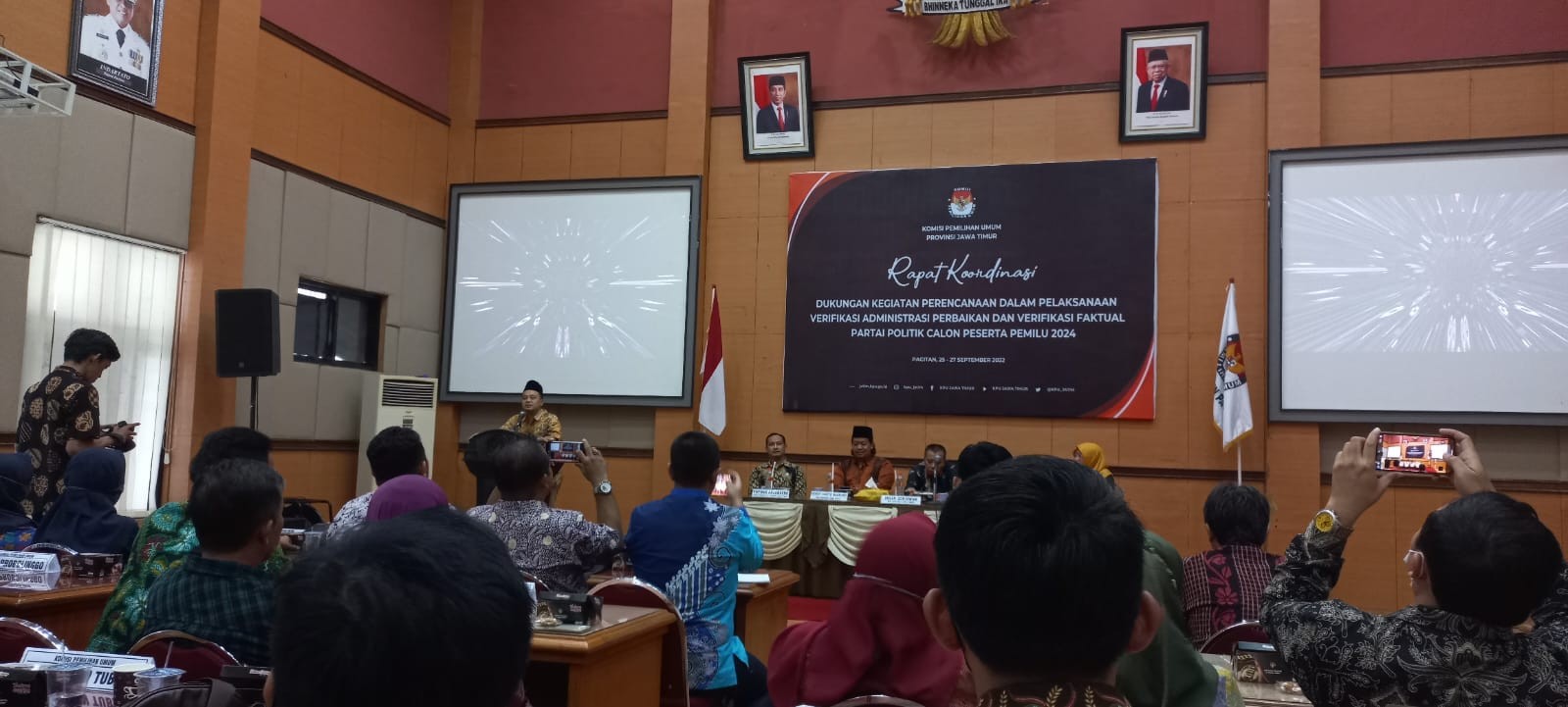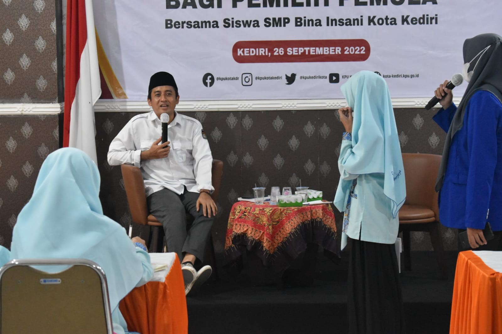 Kediri- Dalam rangka penerapan Kurikulum Merdeka Belajar, sebanyak 25 Siswa-siswi Kelas 7 SMP Bina Insani Kota Kediri mengunjungi Rumah Pintar Pemilu (RPP) Kilisuci KPU Kota Kediri untuk belajar kepemiluan. Didampingi sejumlah guru, para siswa menerima pemaparan pengenalan kepemiluan dari Nasrudin, Anggota KPU Kota Kediri, Divisi Perencanaan, Data dan Informasi pada Senin pagi (26/09). Dalam kegiatan ini, siswa siswi dikenalkan tentang dasar kepemiluan mulai penyelenggara pemilu dan penyelenggaraan pemilu secara singkat. Para siswa dikenalkan dengan penyelenggara pemilu mulai tingkat bawah sampai dengan tingkat pusat. Selain itu, para siswa juga dikenalkan dengan penyelenggaraan pemilu yang harus ada penyelenggara, pemilu, peserta, dan pemerintah. Para siswa cukup antusias menyimak penjelasan dari Nasrudin. Mereka sangat tertarik saat diajak mengelilingi galeri yang ada di RPP Kilicusi. Para siswa diajak mengenali tanda gambar partai pada pemilu sejak 1955 hingga 2019. Selain itu, para siswa juga diajak mengenali peserta Pemilu Presiden sejak 2004 sampai dengan 2019 lalu dan juga Peserta Pilkada baik Pilwali Kota Kediri maupun Pilgub Jatim. Para siswa menyatakan senang diajak belajar kepemiluan. Apalagi mereka juga mulai mengenal prosesi pemilihan di lingkup sekolah seperti pemilihan Ketua OSIS. Sementara itu, menurut Maryam, perwakilan guru yang mendampingi para siswa ini mengatakan bahwa pengenalan kepemiluan langsung kepada penyelenggaranya ini sangat penting untuk menyukseskan penerapan Kurikulum Merdeka Belajar yang terdiri dari dua yaitu Pembelajaran Intrakurikuler dan Projek Penguatan Profil Pelajar Pancasila. Salah satu penekanan dari kurikulum ini dalah suara demokrasi. "Implementasi suara demokrasi salah satunya diwujudkan dengan pemilu, ini penting untuk dikenalkan kepada siswa sejak dini" ungkap Maryam. Dengan pengenalan kepemiluan ini diharapkan siswa mulai terbiasa dengan demokrasi sejak dini dan mengenal penerapan demokrasi di dunia modern seperti apa. im
