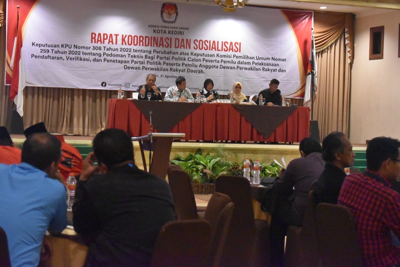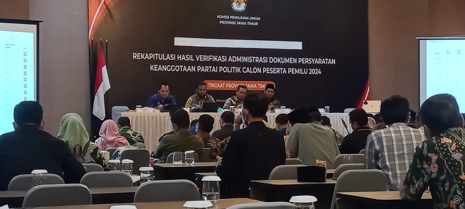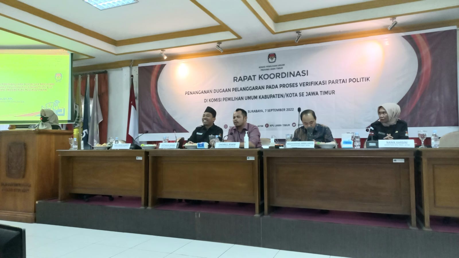 kota-kediri.kpu.go.id - Digelar pada Sabtu-Minggu (10-11) September 2022, KPU Provinsi Jatim undang 38 KPU Kab/kota Se Jatim dalam rakor persiapan Rekapitulasi Verifikasi Administrasi Dokumen Keanggotaan Partai Politik Calon peserta Kemilu 2024. Dalam agenda kegiatan tersebut, masing masing 38 KPU Kab/Kota menyampaikan hasil rekapitulasi di tingkat kab/kota yang telah disampaikan ke Provinsi melalui SIPOL. Sebelumnya, sambutan pembukaan disampaikan oleh Ketua KPU Provinsi Jatim Choirul Anam. Dalam sambutannya Anam menekankan untuk menjaga sinergitas antar divisi, saling support dalam melaksanakan tahapan pemilu 2024. Kemudian dilanjutkan dengan pengarahan umum yang disampaikan secara bergilir oleh Komisioner KPU provinsi jatim. Nurul amalia (divisi perencanaan data dan Informasi) dalam arahannya menekankan kepada KPU kab/kota untuk menjaga dokumen yang saat ini dikerjakan. Senada dengan Nurul, Gogot cahyo Baskoro menyampaikan perlunya memilih dan memilah informasi yang dapat dipublikasikan atau tidak. Dari sisi hukum, (Arbayanto (divisi hukum dan pengawasan) menyampaikan supaya mempedomani peraturan dalam melakukan verifikasi administrasi dokumen persyaratan keanggotaan parpol calon peserta pemilubtahun 2024. Hadir dari KPU Kota Kediri dalam kegiatan tersebut Pusporini Endah Palupi (Ketua KPU Kota Kediri), Nia Sari (divisi Teknis Penyelenggaraan), Reza Cristian (divisi Hukum dan Pengawasan) didampingi kasubbag Teknis Hupmas Arif Suryawan dan Operator Sipol. nhi