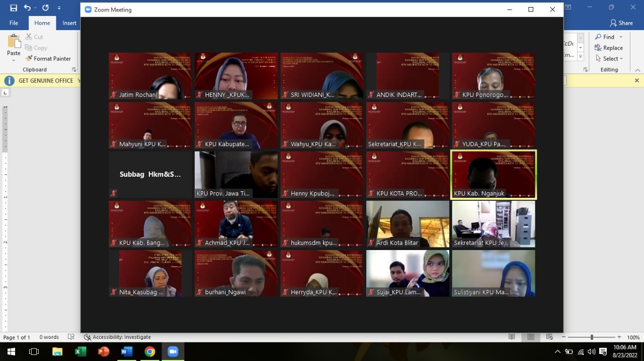 kota-kediri.kpu.go.id _ Senin (29/08), Seluruh Pegawai Negeri Sipil ( PNS) dilingkungan KPU Kota Kediri menghadiri acara melalui Zoom Meeting yang diadakan oleh KPU Provinsi Jawa Timur yaitu Sosialisasi Jaminan Sosial ASN dan Pejabat Negara di Lingkungan Komisi Pemilihan Umum Provinsi dan Komisi Pemilihan Umum Kabupaten/Kota Se-Jawa Timur. Acara dumulai pada pukul 10.00 Wib dibuka oleh Divisi SDM dan Litbang KPU Prov Jatim Ibu Rochani dan pengarahan dari Sekretaris KPU Prov Jatim Ibu Nanik Karsini. Selaku Narasumber adalah dari PT Taspen Persero, Pemateri menjelaskan Udang-Undang ASN No.05/2014 memuat tentang Pengelolaan Jaminan Sosial Bagi ASN. PT Taspen (persero) merupakan jaminan hari tua bagi PNS dan Pejabat Negara dimulai dari masih bekerja hingga seusai masa bakti atau pensiun. memberikan program layanan Taspen yang bermanfaat bagi ASN yaitu Layanan Hari Tua (THT), Layanan Dana Pensiun, Layanan Jaminan Kecelekaan Kerja (JKK), dan Layanan Jaminan Kematian (JKM). PT Taspen menampilkan aplikasi di Smartphone yang Bernama “Otentikasi Taspen” berfungsi agar semua penerima pension menjadi lebih mudah dalam melakukan otentikasi tanpa mengunjungi mitra bayar Taspe. Acara diakhiri dengan sesi diskusi.HN