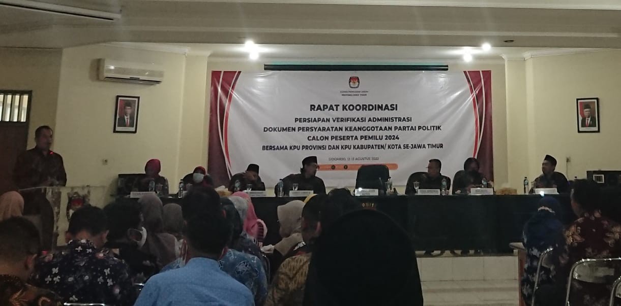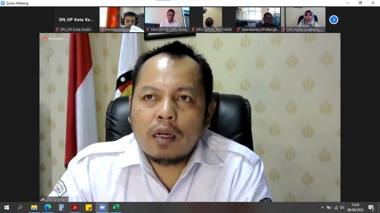 kota-kediri.kpu.go.id _ Kediri (12/08) KPU Kota Kediri menghadiri Rakor Persiapan Verifikasi Administrasi Dokumen Persyaratan Keanggotaan Partai Politik Calon Peserta Pemilu 2024 bersama KPU Kab/Kota Se Jawa Timur. Hadir dalam rakor tersebut Nia Sari (Divisi Teknis Penyelenggaraan) dan Arif Suryawan (Kasubbag Teknis Hupmas). Dibuka oleh Choirul Anam (Ketua KPU Jatim) tepat Jam 15.30 WIB. Pada sambutan pembukanya Choirul Anam menyampaikan bahwa diselenggaraknnya rakor ini adalah dalam rangka penyamaan persepsi terkait Peraturan KPU No 04 Tahun 2022 dan SK KPU No 260 tentang Pedoman teknis verifikasi administrasi keanggotaan Partai Politik calon peserta pemilu 2024. Diawali dengan sesi pengarahan oleh 4 anggota komisioner KPU Jatim, rakor tersebut diselenggarakan selama dua hari tanggal 12 dan 13 Agustus 2022. Sesi utama yakni sesi bedah peraturan KPU No 04 Tahun 2022. Dalam sesi tersebut dibahas tentang berbagai daftar kemungkinan masalah yang timbul dalam proses verifikasi administrasi keanggotaan partai politik. Insan Qoriawan menekankan bahwa tugas pokok KPU Kab/Kota adalah membnatu KPU RI melaksanakan vermin awal tanggal 14 – 29 Agustus 2022 berpegang pada pasal 36 PKPU No 04 Tahun 2022 pungkas Insan qoriawan (Divisi Teknis KPU Jatim). Ars