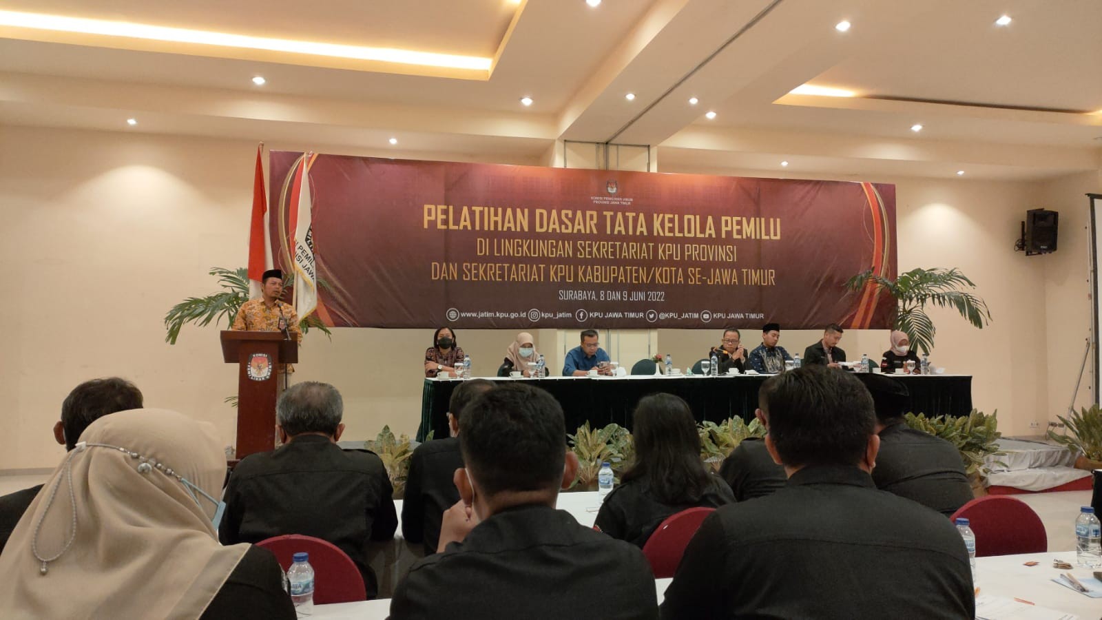 "Pelatihan dasar tata kelola pemilu ini diadakan dengan tujuan selain sebagai pembekalan bagi ASN juga sebagai konsolidasi organisasi dalam persiapan Pemilu 2024," terang Nanik Karsini Sekretaris KPU Provinsi Jawa Timur dalam sambutan pembukaan pelatihan.