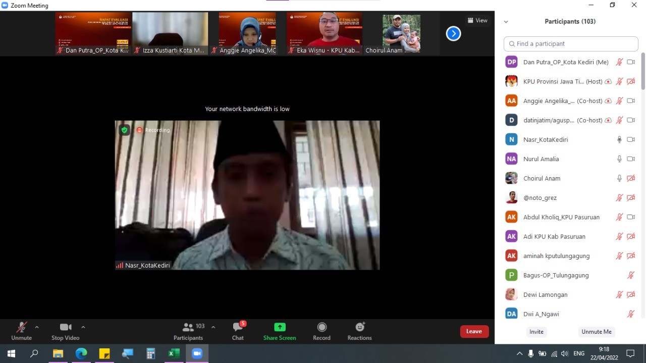 kota-kediri.kpu.go.id - Jumat (22/04) KPU Kota Kediri melalui Divisi Perencanaan, Data, dan Informasi (Nasrudin), Kasubbag Perencanaan, Data, dan Informasi (Annisaa Dyah Kusuma), dan Operator Sidalih Berkelanjutan (Danu Prasetyo) dengan seluruh KPU Kabupaten/Kota se-Jawa Timur mengikuti Rapat Evaluasi Pemutakhiran Data Pemilih Berkelanjutan Triwulan I Tahun 2022. Acara tersebut diselenggarakan dalam jaringan (daring) melalui Zoom Meeting pukul 09.00 WIB.