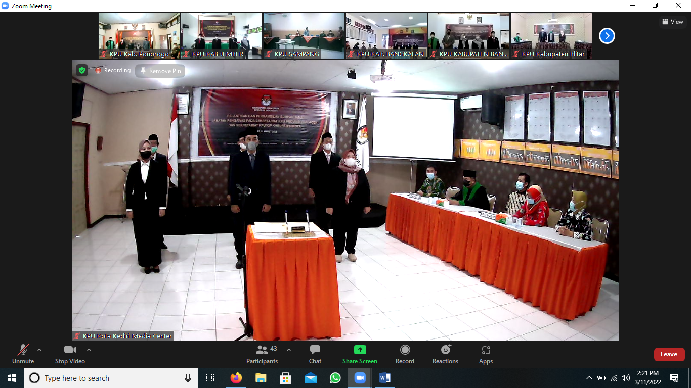 kota- kediri.kpu.go.id -Jum'at (11/3) Sekjen KPU RI melantik 2.123 Pejabat Pengawas di lingkungan Sekretariat KPU/KIP Provinsi dan KPU/KIP Kabupaten /Kota melalui media daring. Untuk wilayah Jawa Timur, melalui KPU Provinsi Jawa Timur sendiri ada sekitar 155 Pejabat pengawas yang dilantik pada hari itu. Nanik Karsini, selaku sekretaris KPU Provinsi Jawa Timur melantik pejabat pengawas di lingkungan Sekretariat KPU Provinsi Jatim dan KPU Kab/Kota Se Jatim secara hybrid. Nanik Karsini juga menyampaikan harapannya kepada seluruh pejabat yang dilantik untuk mampu mengemban tugasnya dengan baik, lebih kompetitif, inovatif produktif serta akuntable dalam mempersiapkan penyelenggaraan Pemilu dan Pemilihan Serentak Tahun 2024. Di lingkungan Sekretariat KPU Kota Kediri sendiri ada 6 ASN yang dilantik dan diambil sumpahnya untuk menduduki jabatan pengawas baik di KPU Kota Kediri maupun di KPU Kab/Kota lain. ASN tersebut antara lain : Ermawanto ( Kasubbag Keuangan ,Umum dan Logistik pada Sekretariat KPU Kota Kediri),Henny Nurdiany (Kasubbag Hukum dan SDM pada Sekretariat KPU Kota Kediri), Arif Suryawan (Kasubbag Teknis dan Hupmas pada Sekretariat KPU Kota Kediri), Annisa Dyah Kusuma (Kasubbag Program dan Data pada Sekretariat KPU Kota Kediri), Zaenuddin Mahfud (Kasubbag Program dan Data pada Sekretariat KPU Kabupaten Blitar), Donny Hendrawan (Kasubbag Teknis dan Hupmas pada Sekretariat KPU Kabupaten Kediri). Suroto Sekretaris KPU Kota Kediri mengaku bangga kepada jajarannya dan memberikan semangat terutama kepada pejabat yang dilantik, dimanapun dan apapun posisinya agar tetap memberikan yang terbaik dalam mempersiapkan penyelenggaraan Pemilu dan Pemilihan 2024 nanti. Untuk diketahui, pelantikan dan pengambilan sumpah/janji jabatan di Sekretariat KPU Kota Kediri disaksikan oleh Komisioner KPU Kota Kediri dan rohaniawan. nhi