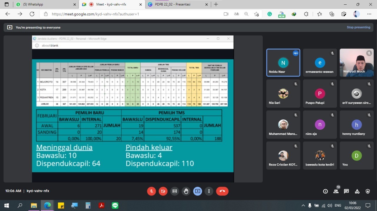 Lebih lanjut Nasrudin menjelaskan total jumlah pemilih sebanyak 207.185 dengan pemilih laki laki sebanyak 101.387 dan pemilih perempuan sebanyak 105.798 yang kemudian ditetapkan dalam berita acara nomor 17/PK.01/3571/3/2022 tentang Rekapitulasi Daftar Pemilih Berkelanjutan Bulan Februari Tahun 2022. Dalam rapat pleno daring tersebut, KPU Kota Kediri turut mengundang Ketua Bawaslu Kota Kediri (Mansur), selain juga dihadiri oleh Komisioner, Sekretaris dan Kasubbag KPU Kota Kediri. "Program PDPB ini dapat berjalan karena peran aktif dari bawaslu, dispendukcapil, dinas/instansi lain serta intern pegawai KPU Kota Kediri, kami mengucapkan terima kasih dan semoga peran aktif dari masyarakat juga bisa lebih meningkat lagi, sehingga data pemilih kita semakin valid dan bermutu.