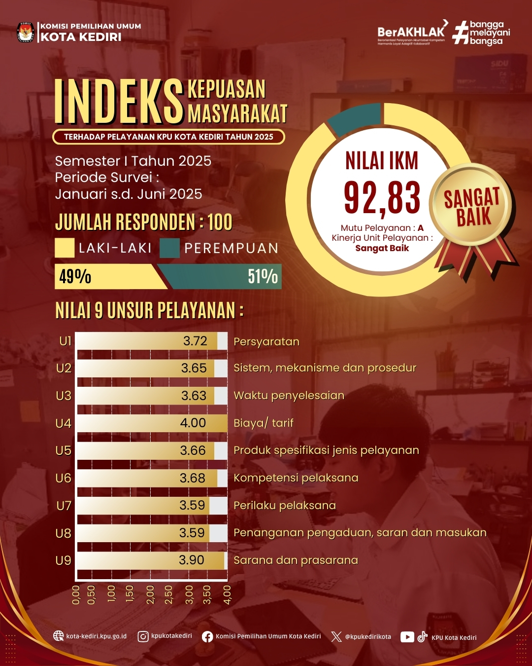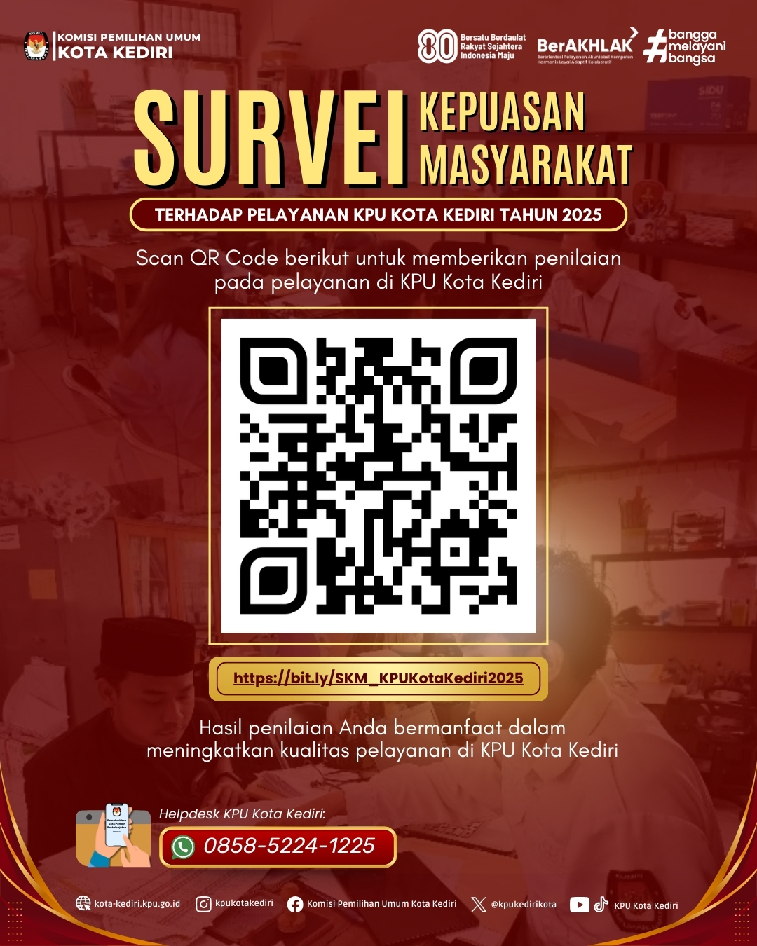 Dalam rangka meningkatkan kualitas pelayanan publik KPU Kota Kediri, mohon bantuan untuk mengisi Survey Kepuasan Masyarakat Triwulan III Tahun 2025. Terima kasih dan selamat beraktivitas.